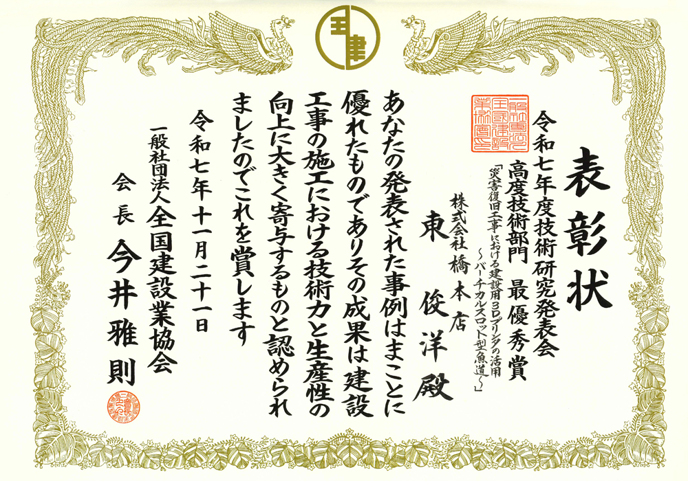 2025(令和7)年11月25日、一般社団法人 全国建設業協会の「技術研究発表会」にて、高度技術部門・最優秀賞を当社社員の東 俊洋が受賞いたしました。